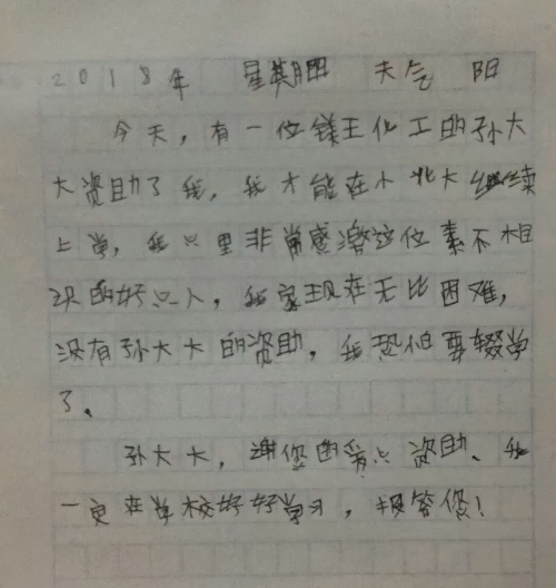 当年8月份,纪某某和贾某某两位学生分别以优异的成绩考入石家庄铁道学院和河北工程技术学院。因家庭收入过低,无法支付昂贵的学费,家人一筹莫展,得知情况后,孙文董事长慷慨解囊,分别给予纪某某10000元、贾某某6000元的资助。受助家长激动地说,真不知道怎么感谢董事长的恩情,两位学生表示,一定不辜负孙文董事长的爱心和厚望,努力学习,用优异的成绩回报社会。
