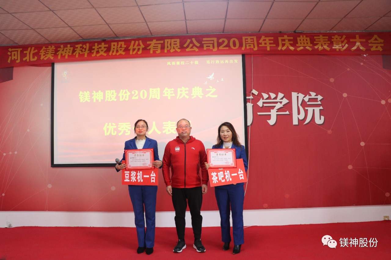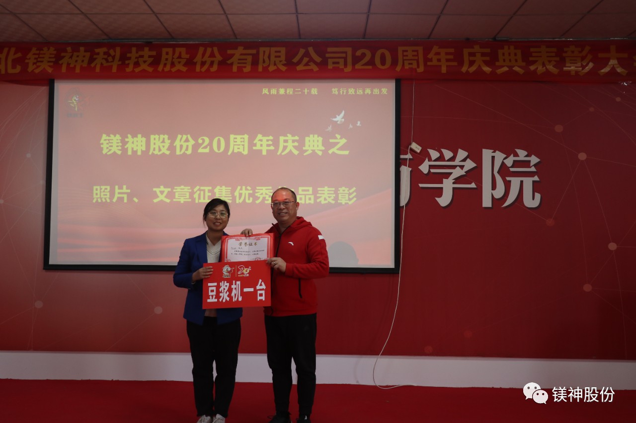 与庆典表彰大会一同举办的还有二十周年庆相关征文活动颁奖典礼。海南公司员工李红娇的作品“献给镁神二十周年”拔得头筹。