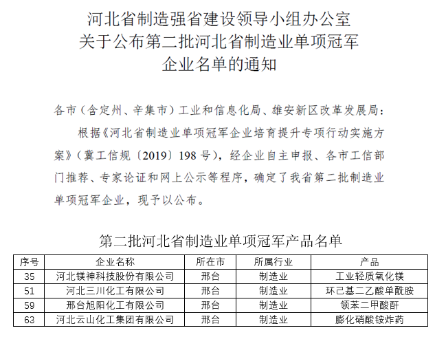 新年新气象,企业再添新荣誉,争得开门红,近日,河北省工业和信息化厅官方网站公布了2020年“制造业单项冠军产品”企业名单,我公司生产制造的“工业轻质氧化镁”获得了河北省制造强省建设领导小组授予的“制造业单项冠军产品”称号。本次邢台市通过4家,我们是其中1家。