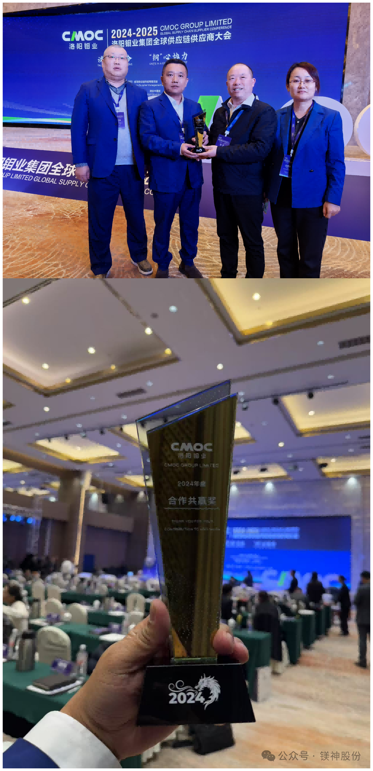 该奖项不仅是对河北镁神科技股份有限公司过去一年辛勤付出和卓越成就的高度认可,也是对其未来发展的深切期待。镁神科技将继续秉持合作共赢的理念,与洛钼集团以及更多合作伙伴携手共进,共同美好未来!