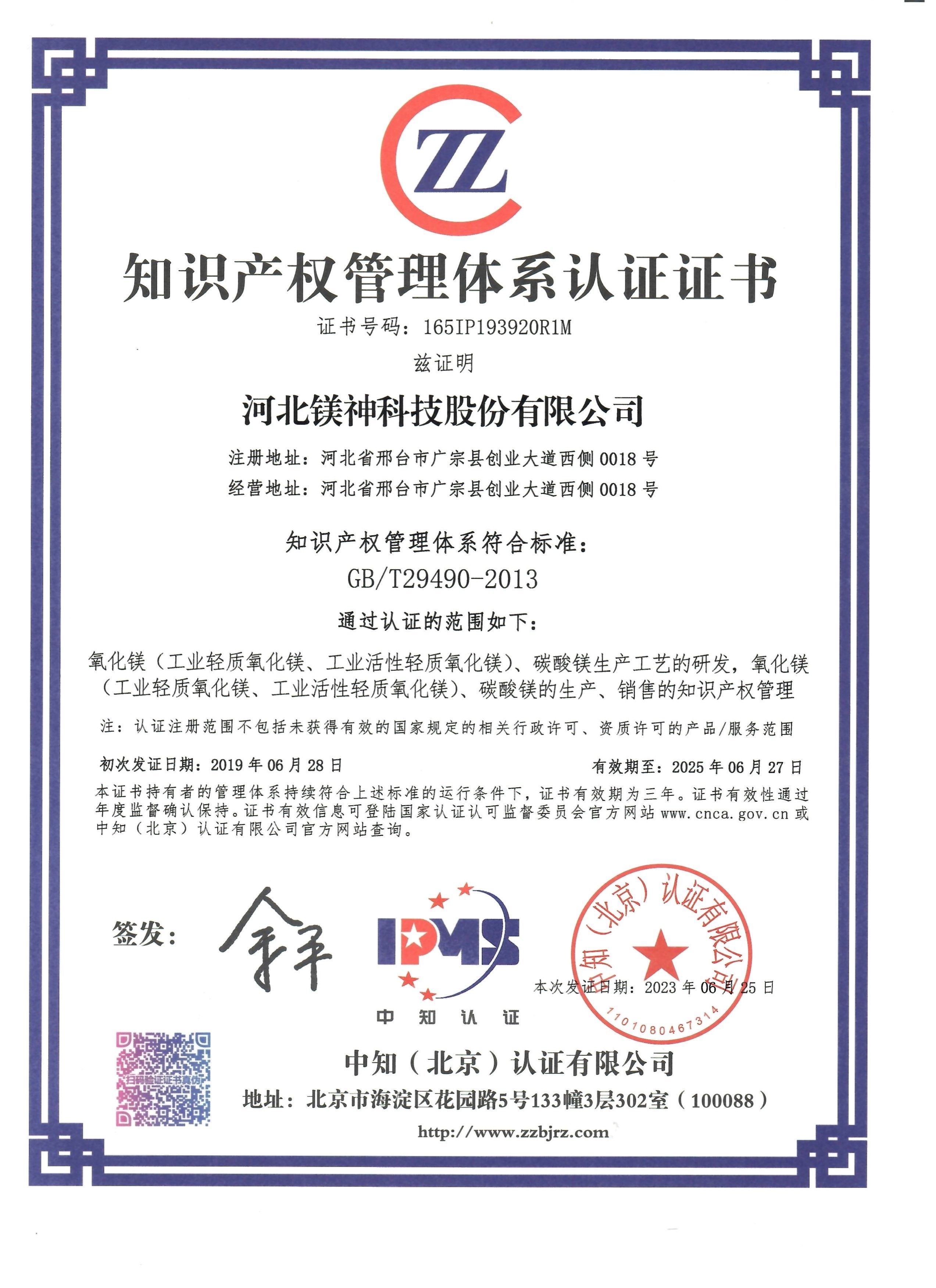 知识产权管理体系认证证书