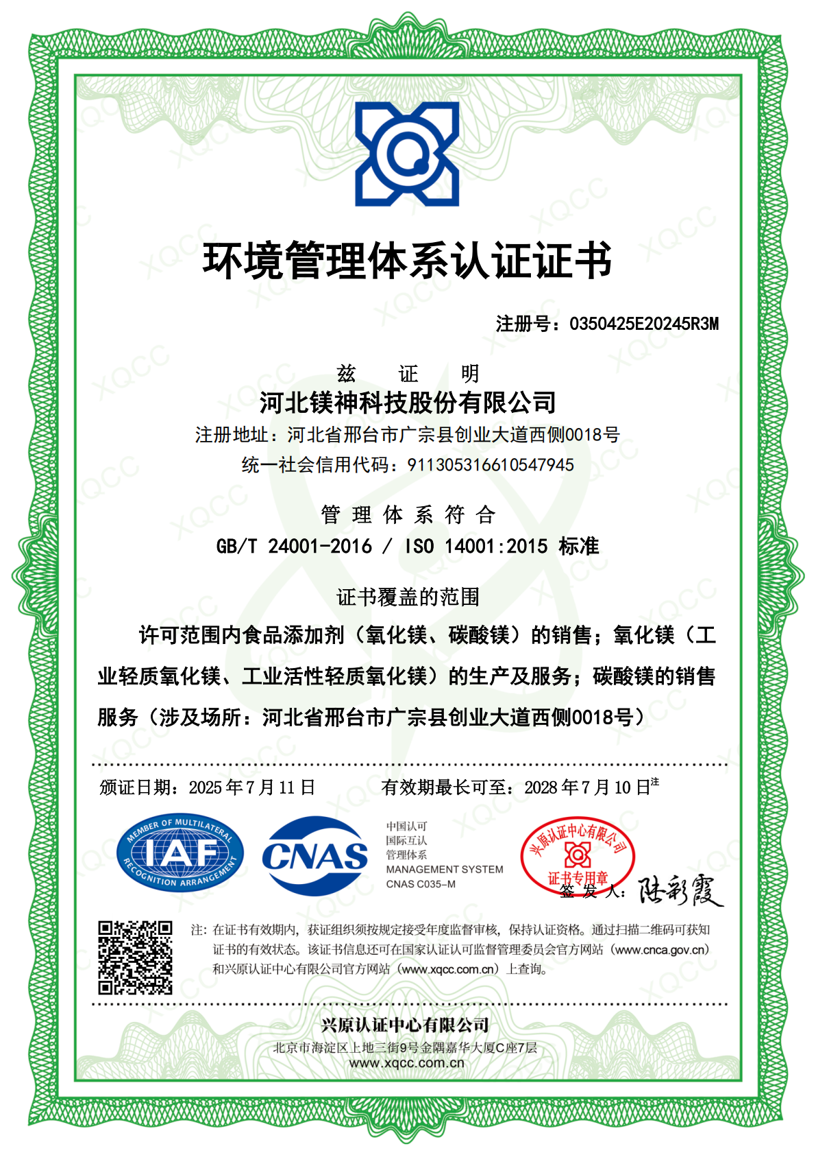 环境管理体系认证证书