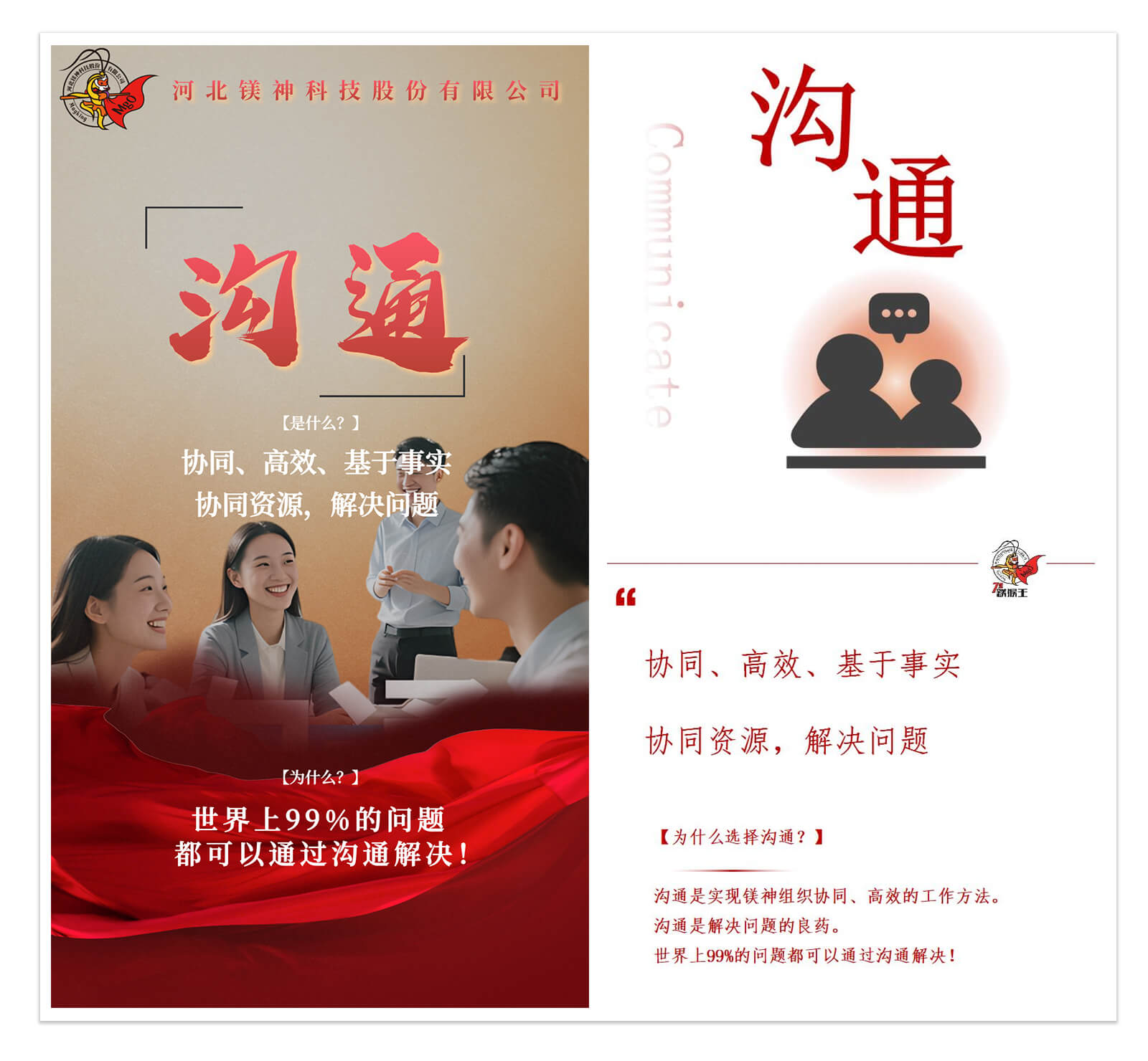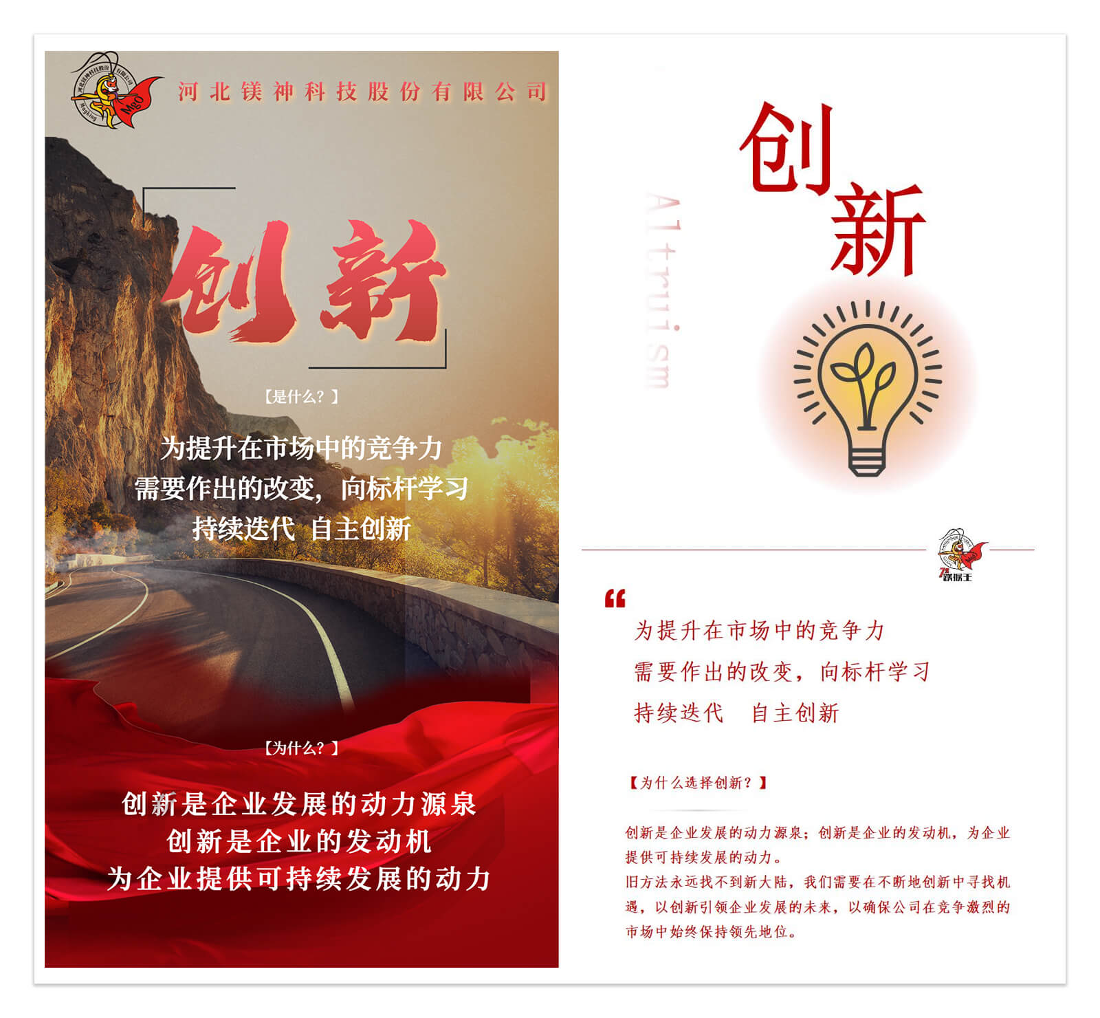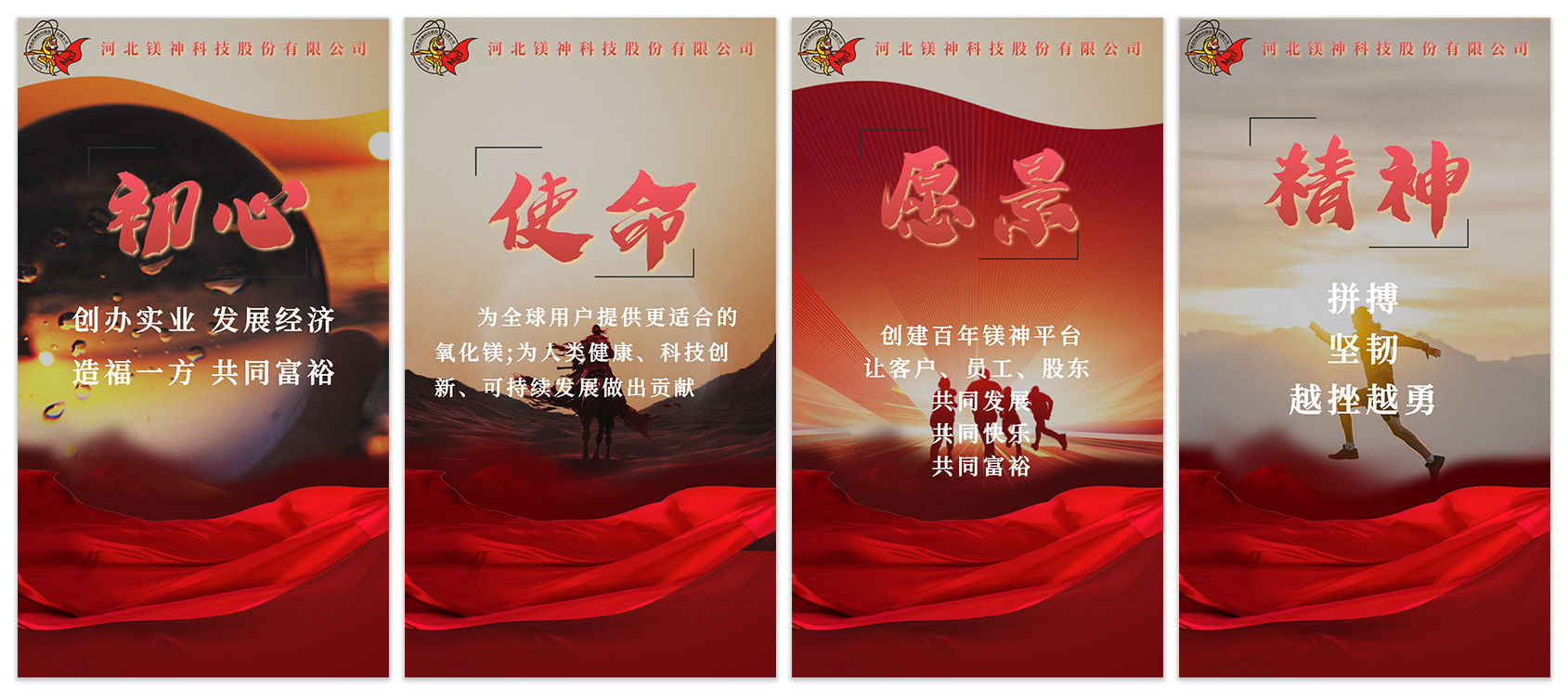 镁神科技以创办实业,发展经济,造福一方,共同富裕为初心;秉承着为全球用户提供更适合的氧化镁,为人类健康、科技创新、可持续发展作出贡献的使命;有着创建百年镁神平台,让客户、员工、股东共同发展、共同快乐、共同富裕的美好愿景;培育出拼搏、坚韧、越挫越勇的镁神人。镁神人用诚信、激情、梦想、狂学、内省、沟通、合作、创新、利他的价值观向客户、社会各界朋友诠释着镁神的企业文化!
