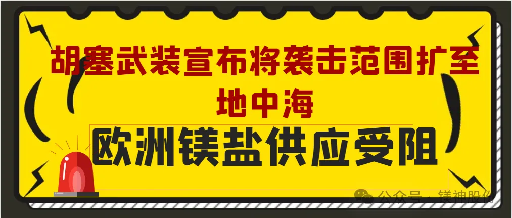 5月3日,胡塞武装宣布:行动升级,将袭击范围扩至地中海,所有向以色列输送货物的船只发起袭击,此次冲突升级后对欧洲镁盐供应产生巨大影响。特别是死?;т逡涤邢薰荆―EAD SEA BROMINE COMPANY LTD),作为全球的镁盐供应商之一,此次攻击导致该区域镁盐供应中断,给多个行业带来巨大冲击。